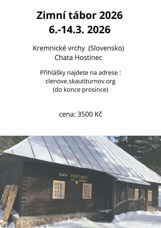 Plánujeme Zimní tábor 2026 1 prosince, 2025 Ahoj! Přijměte pozvání na zimní tábor – letos plánovaný do Kremnických vrchů nedaleko Bánské Bystrice na chatu Hostinec. Doufáme, že nám bude přát počasí a užijeme si prázdniny plné běžkování.