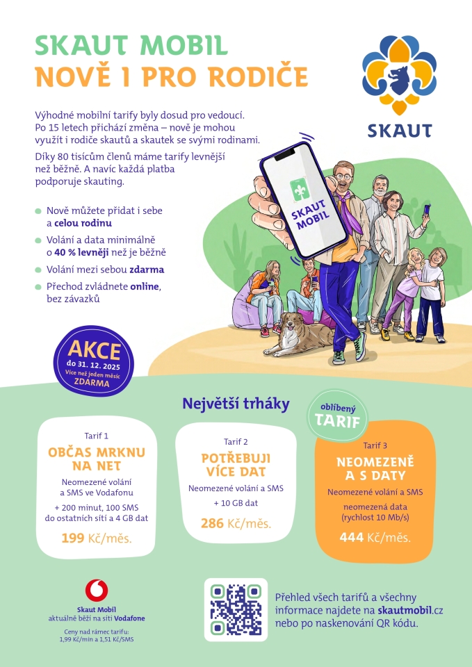 Akce střediska Skaut Mobil nově i pro rodiče 10 září, 2025 Hola, hola! Skaut Mobil můžou nově využívat i rodiče benjamínků, světlušek, vlčat, skautů a skautek. Díky síle naší komunity jsme si u Vodafonu domluvili volání a data za ceny, na které se běžní zákazníci nedostanou. Přidat můžete až 7 čísel a pokud se připojíte do konce roku, máte začátek používání…