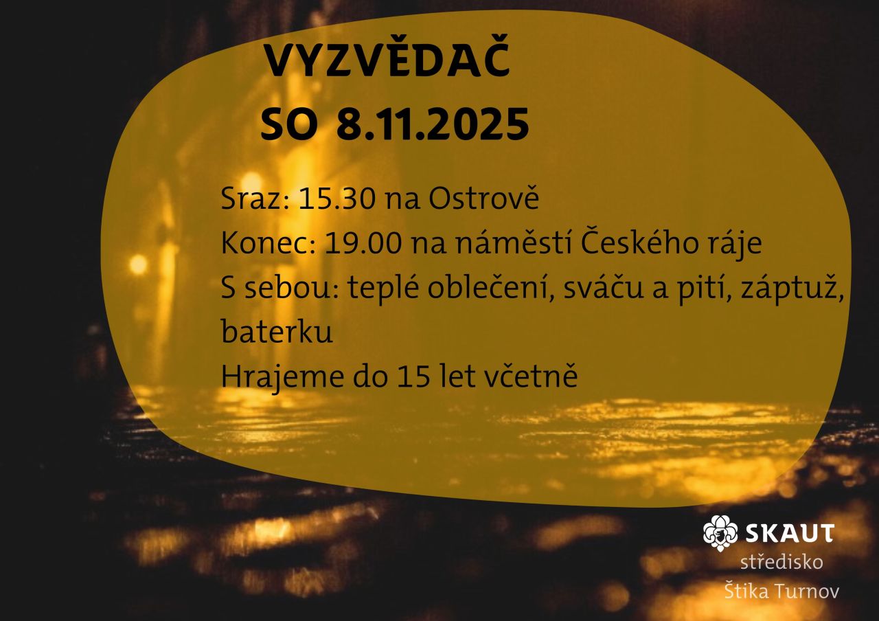 Akce střediska Vyzvědač je opět tady 11 října, 202511 října, 2025 Vydejte se do temných turnovských uliček v tradiční celostřediskové hře. Vyrazte na výzvědy, uchraňte své území a získejte pro svůj tým co nejvíce bodů! Všechny podstatné informace najdete na plakátku.